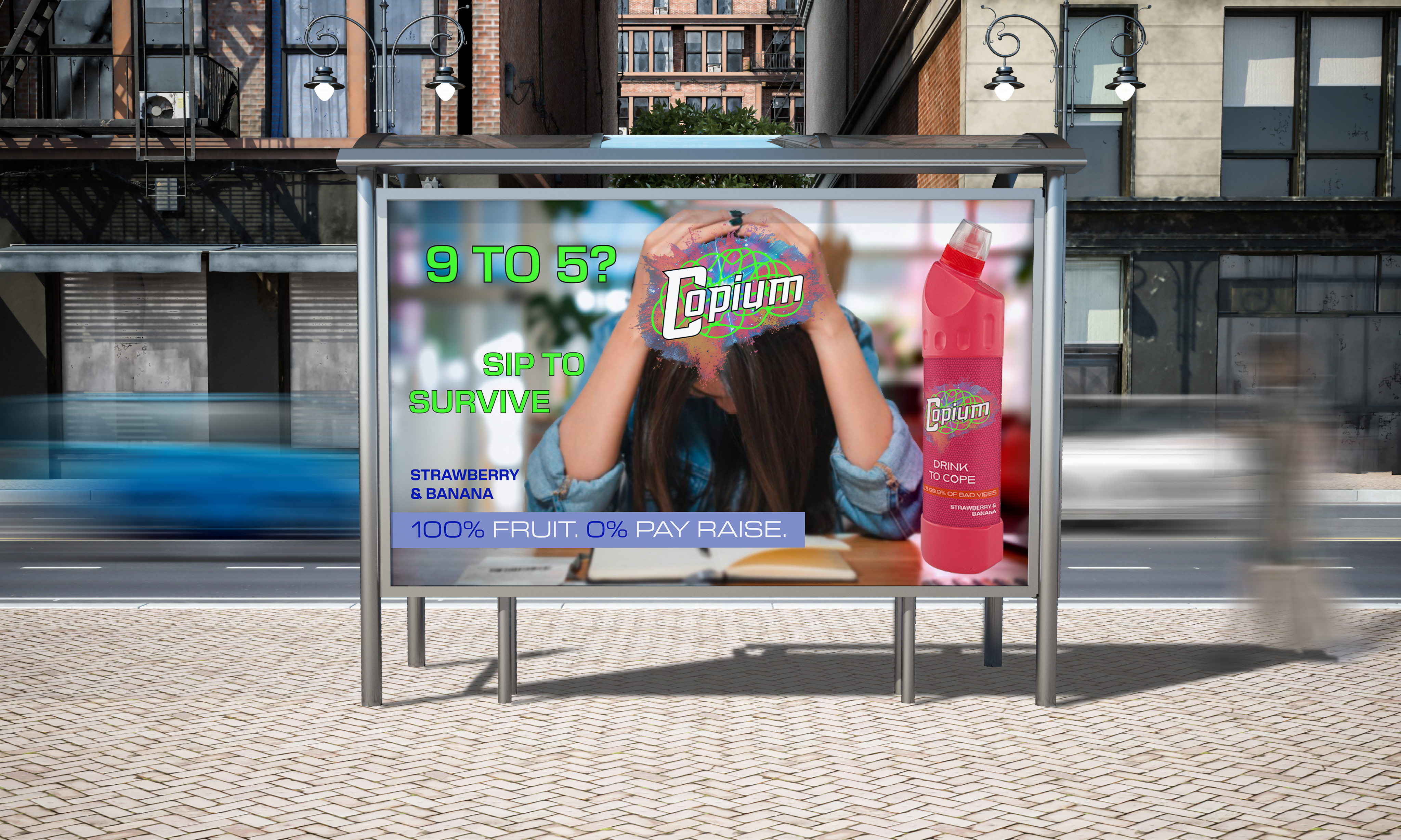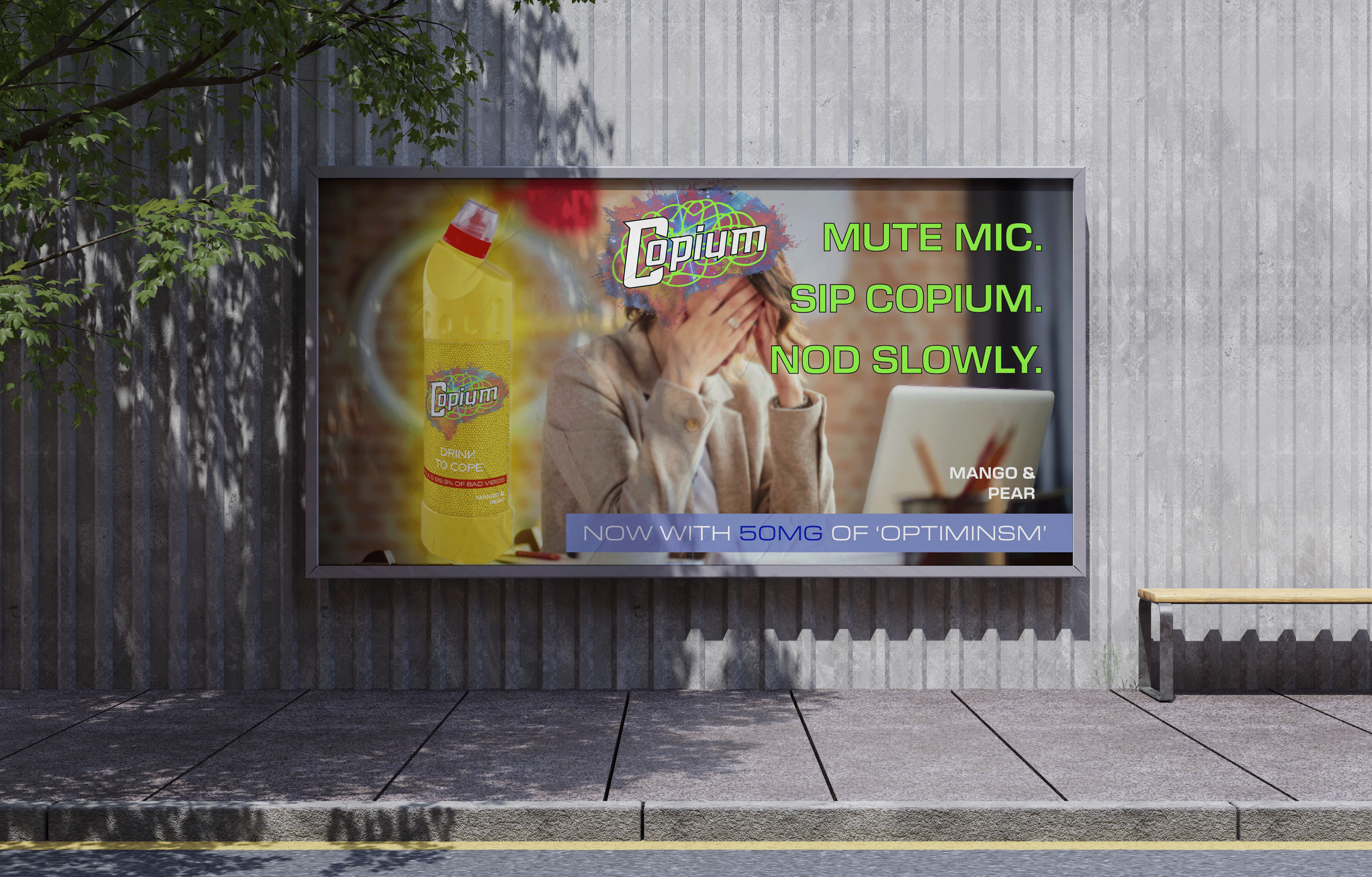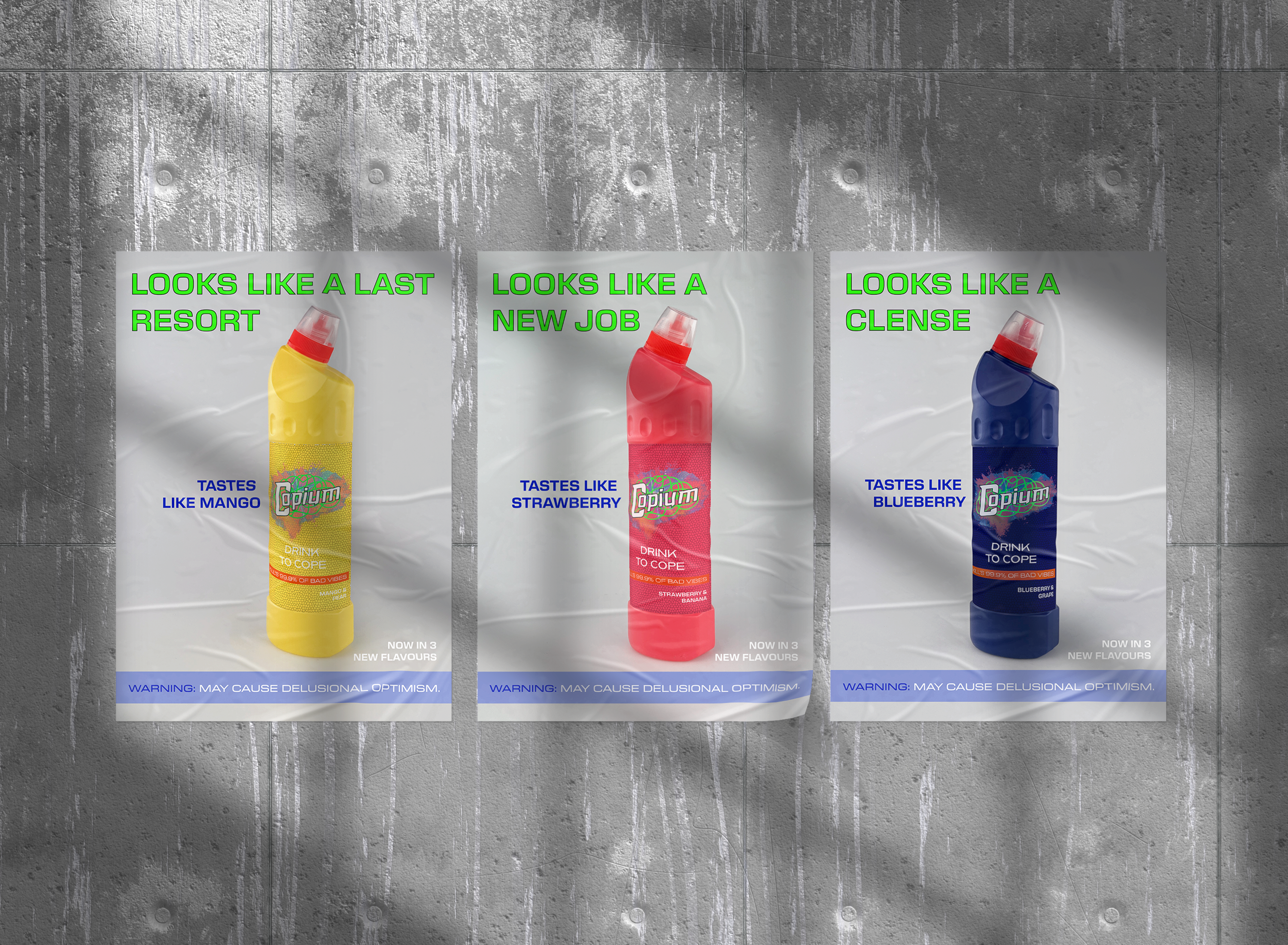Inspired by meme culture and healthy eating, the idea is centred around selling a fruit smoothie in a bleach bottle and marketing it as “Copium” - a satirical remedy for coping.