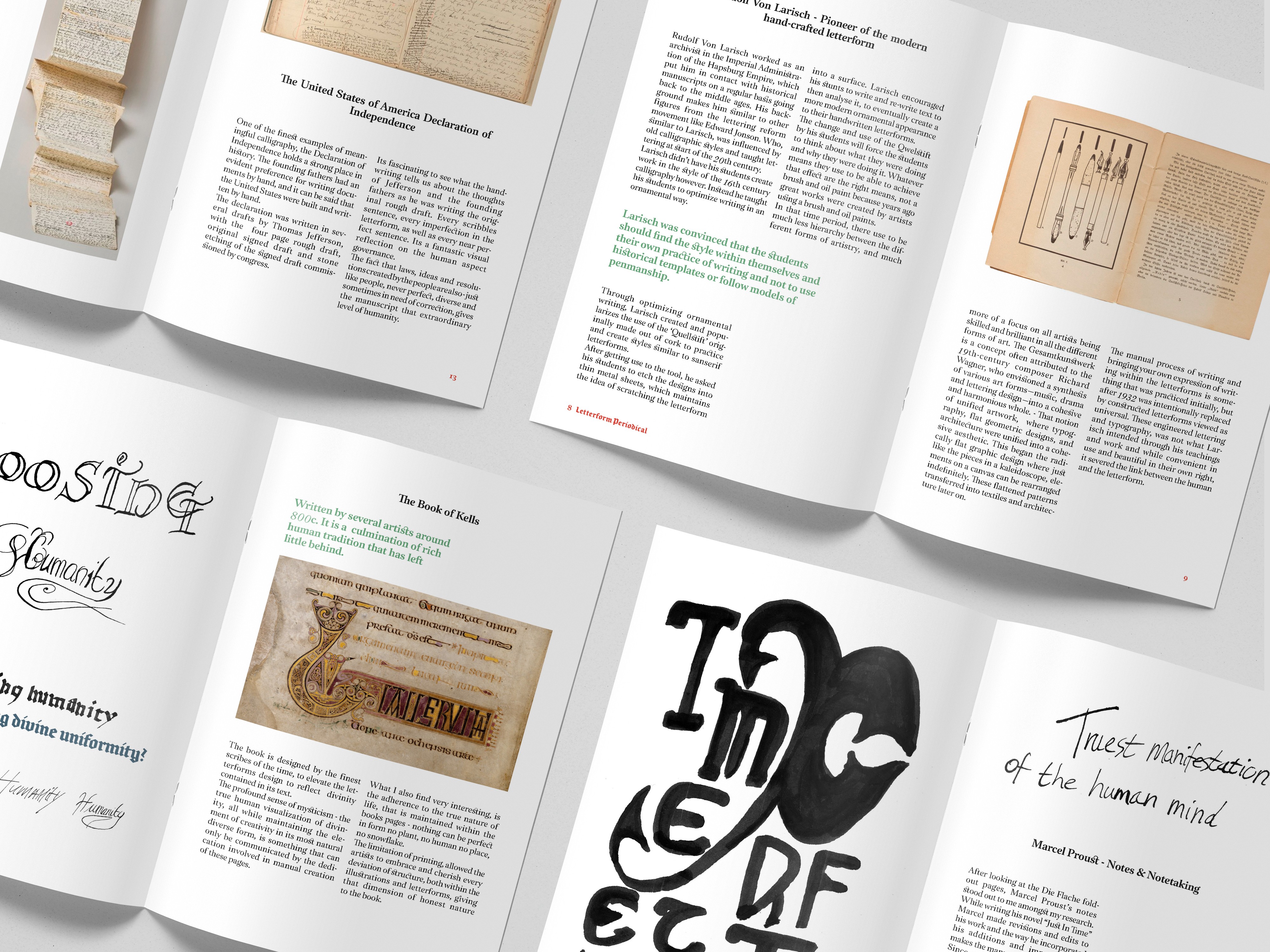 The final piece was designed in the style of modern design magazines, to create a deliberate tension between modern editorial form and the organic nature of handwritten letterforms, which were created using a self-made made writing tool called the “Quellstift”.